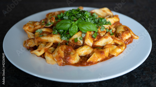 ready to eat, homemade tortelloni stuffed with prosciutto in tomato sauce with basil