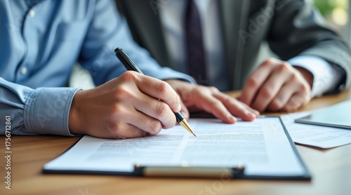 real estate agent senior clients concept. Two hands signing a document on a wooden table in a professional setting.