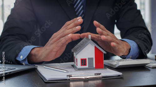 Real estate brokers are shaking hands to congratulate buyers after agreeing to insure and buy a house project. , Home Insurance Ideas home and land mortgage