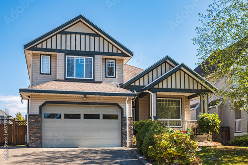 Real Estate Exterior Front House on a sunny day. Big luxury house with nicely landscaped front yard, driveway to garage