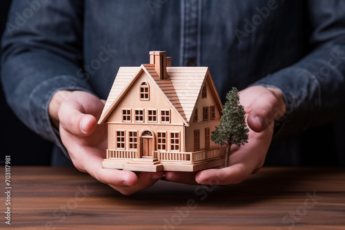 Real Estate Investment Concept : businessman Hand Holding Wooden House Model - Symbolizing Property Purchase and Housing Market Investment