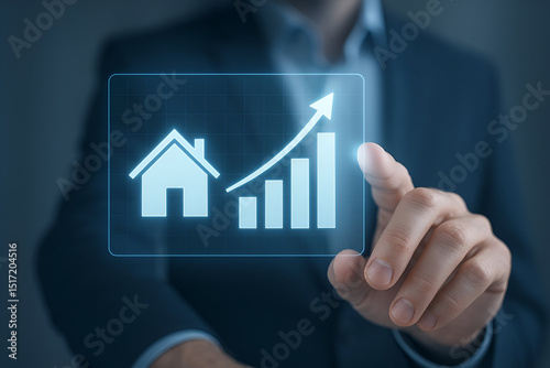 growth, businessman, touching, graph, chart, house, business, finance, investment, technology, success, development, datum