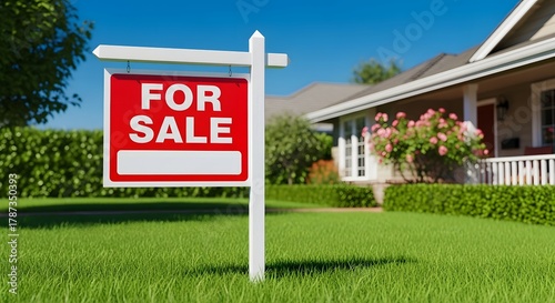 Real estate marketing scene of house for sale with red sign in lush green yard