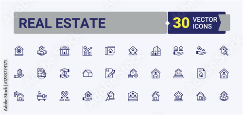 Real Estate set of modern icons. It contains symbols to marketing, bathroom, search, on, loan and more. Outline icon collection. Solid line editable vector illustration.