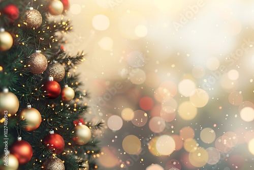 christmas, tree, ornament, realistic, three-dimensional, festive, holiday, decoration, light, bokeh, green, background, shiny, gold, red, seasonal, celebration, joyful, beauty, nature, winter, magic, sparkle, bright, cheerful, tradition, charming, cosy, twinkling, design, texture, art, vibrant, arrangement, closeup, indoor, new year, family, gathering, warmth, mood, elegant, display, atmosphere, colourful, visual