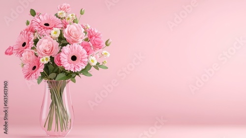 Realistic 3D Render of a Beautiful Bouquet of Pink Flowers in a Clear Vase Against a Soft Pink Background