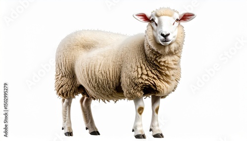 Realistic Adult Sheep with Thick White Wool Standing Isolated on White Background