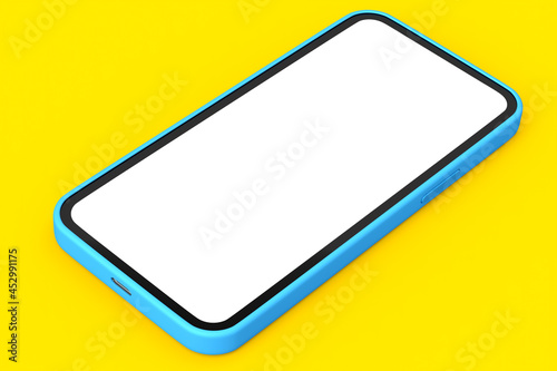 Realistic blue smartphone with blank white screen isolated on yellow background