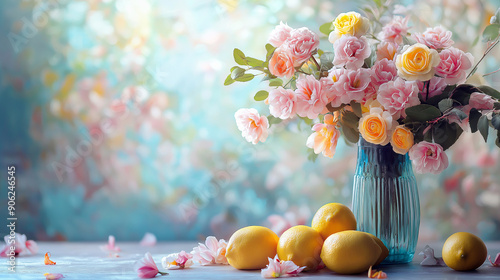 Realistic bouquet of flowers in a vase standing on the table, lemons lie nearby