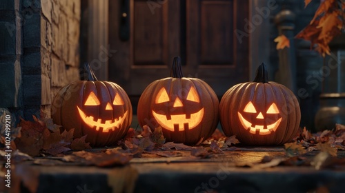Realistic carved pumpkins with glowing faces, placed on a rustic porch with autumn leaves scattered around. Halloween ambiance.