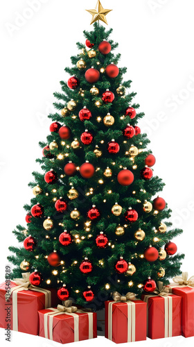 Realistic Christmas Tree Illustration with Red and Gold Ornaments on a Transparent Background Featuring Festive Holiday Decorations with Presents Gifts and Star Celebration