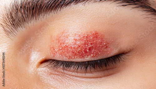 Realistic depiction of seborrheic dermatitis characterized by inflammation and scaling on eyelids, showcasing the intricate details and textures of the skin condition. Seborrheic Dermatitis.
