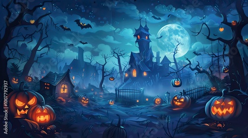 halloween, pumpkin, moon, night, illustration, holiday, autumn, sorcerer, bat, cartoon, vector, horror, skittish, dark, scarey, tree, october, celebration, ghost, orange, black, design, haunted, silhouette, card, evil, castle, party, house, bat