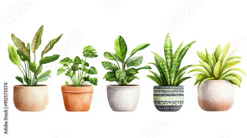 realistic, illustration, potted plants, lush green leaves, unique textures, varying designs, varying colors, varying sizes, cohesive aesthetic, white background, clean, minimalist, natural beauty, det
