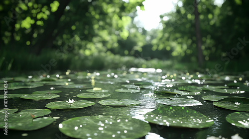Realistic Image - Serene Lily Pads in Forest Pond