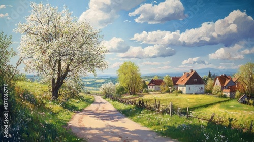 realistic painting of of beautiful landscape of Szczyrk in Poland during spring or summer, cosy light