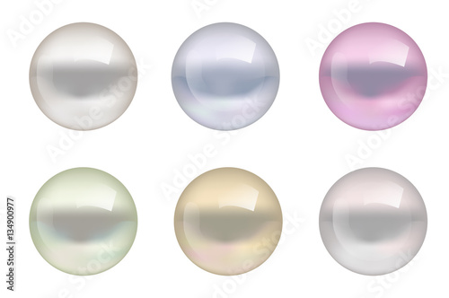 Realistic pearls of different colors set. Collection of jewelry gems isolated on white background. Vector illustration