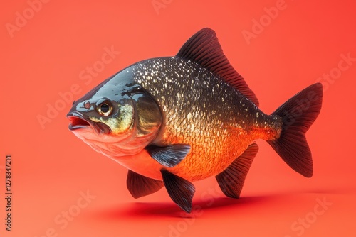 piranha, fish, red, background, animal, realistic, illustration, underwater, marin, wildlife, aquatic, fresh water, predator, carnivore, teeth, dangerous, aggressive, nature, tropical, south, america, amazon, river, water, creature, isolated, studio, shot, orange, fin, scale, eye, gill, jaw, mouth, sharp, pointy, dark, black, grey, silver, metallic, shadow, high-coloured, closeup, detail, full
