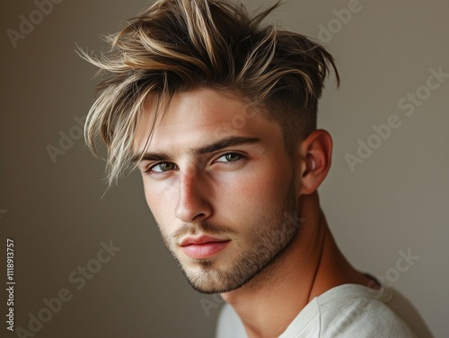 Realistic portrait of a modern man with a trendy haircut, featuring a fade on the sides and longer, textured hair on top styled in a messy, natural look