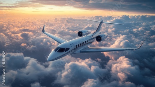 Realistic rendering of an airplane flying over the cloud tops, with the bright blue sky and sunlight illuminating its body