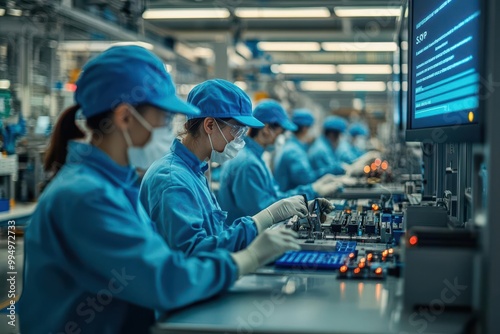 Realistic scene of a team of workers following SOPs on a factory floor, clear instructions displayed on a screen