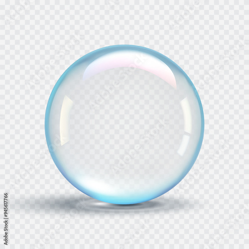 Realistic transparent soap bubble with subtle blue tint and soft shadow effect on transparent background. Water clear drops cosmetic skincare product. Vector 3d illustration