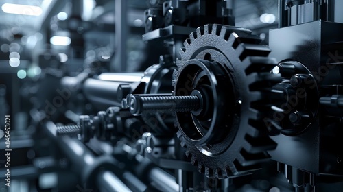 Realtime monitoring of rusty gears in industrial machines, side view, showing dynamic maintenance processes, futuristic tone, black and white