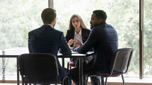 Rear view African Caucasian businessmen in suits sit at desk with European businesswoman, involved in issues solving, brainstorming, colleagues listen project leader during formal meeting in boardroom