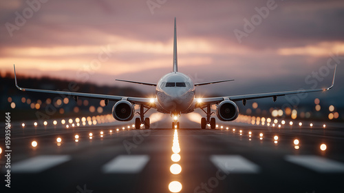 Rear view of a commercial airliner parallel to an airport runway at dusk, runway lights shining into the distance, the sunset sky a soft purple and orange.