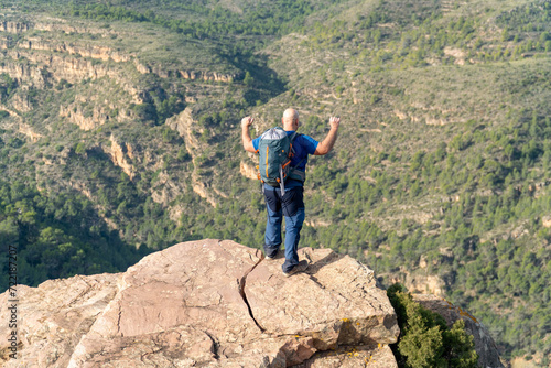 Rear view of a mountaineer hiker celebrating with his arms raised on a rock