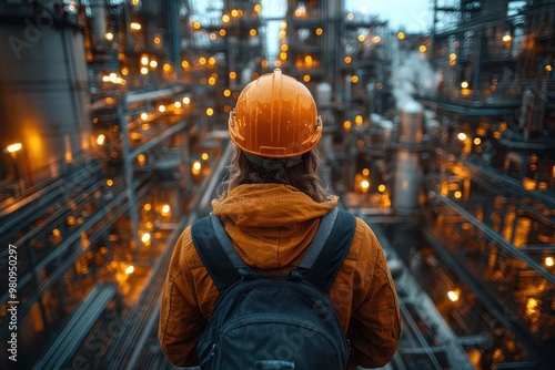 rear view of a worker in safety gear observing a bustling factory floor symbolizing workplace safety and industrial progress in a dynamic manufacturing environment