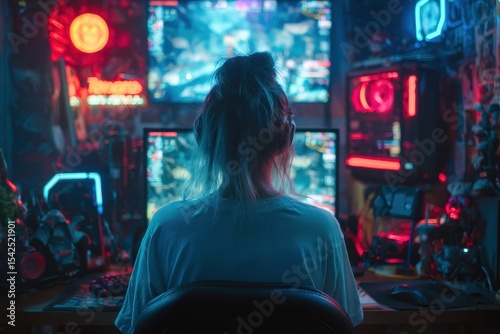 game, gamer, computer, online, play, girl, vertical, person, neon, competition, young, cyber, sport, screen, three-dimensional, female, cyberspace, abstract, woman, technology, space, microphone, earphones, graphic, working, teenage, electronic, keyboard, stream, enjoyment, gaming, headset, player, gun, studio, joy, competitive, action, alone, broadcasting, display, shooting, talking, tournament