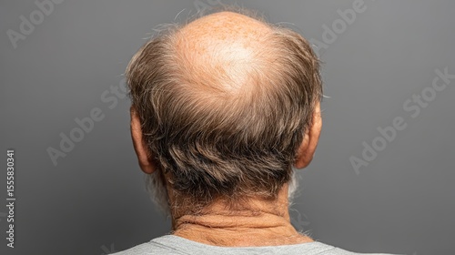 Rear view of an older man with visible balding crown and surrounding gray hair, symbolizing age-related hair loss and male pattern baldness awareness