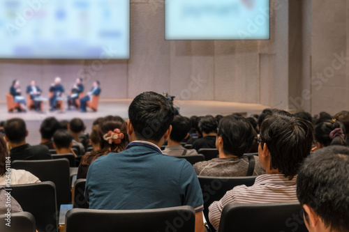 Rear view of Audience over the speakers on the stage in the conference hall or seminar meeting, business and education concept
