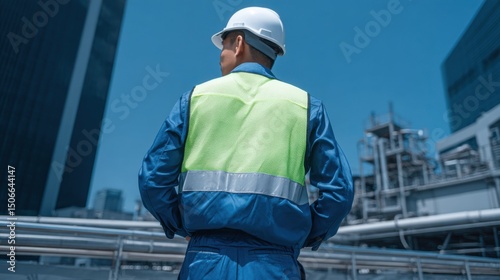 Rear view of construction worker in blue uniform and safety vest standing on rooftop industrial site under clear sky perfect for infrastructure projects, engineering visuals and safety campaigns