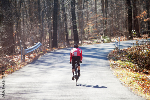 bicyclist, riding, bicycle, road, forest, backview, athlete, tree, sportsman, tree trunk, exercising, nature, sport, sitting, cycling, preparation, motion, transportation, activity, athleticism, concentration, wood, holding, helmet, confidence, shadow, travel, timberland, sunlight, healthy lifestyle, environment, full-length, day, outdoors, one person, male