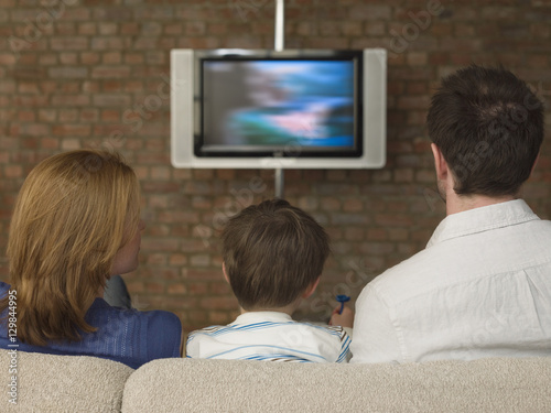 30s, adult, back, boy, casual attire, caucasian, children, childhood, control, cute, elementary, family, father, female, home, horizontal, house, indoor, leisure, little, love, male, man, man, miami, mother, pastime, people, person, backview, human relationships, remote, sitting, sofa, son, technology, television, three, together, togetherness, television, watching, woman, woman, young