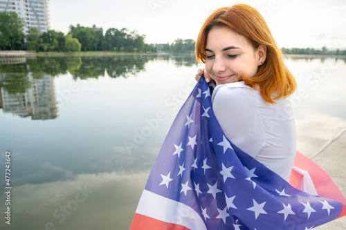 Rear view of happy red haired girl with USA flag on her shoulders. Positive young woman celebrating United States independence day