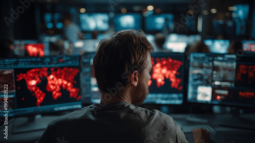 Rear view of IT security professional monitoring multiple computer screens with global red alert maps.