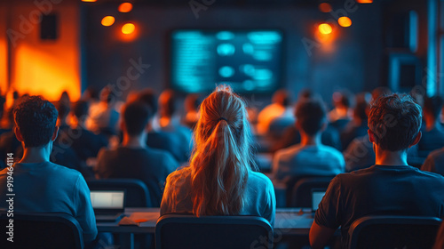 Rear view of people in audience at the conference hall, Speaker giving a talk in conference hall at business event.
