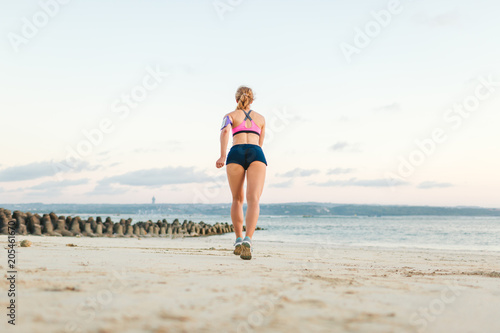 rear view of sportswoman with smartphone in running armband case jogging on sandy beach