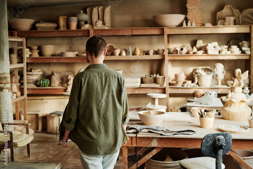 Rear view of woman going to her workplace, she working in ceramic workshop