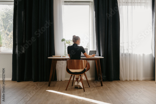 working, home, student, businesswoman, window, studying, office, entrepreneur, backview, computer, table, freelance, living room, interior, education, remote, young adult, female, domestic life, unrecognizable, person, indoor, people, cosy, day, sunlight, modern, sitting