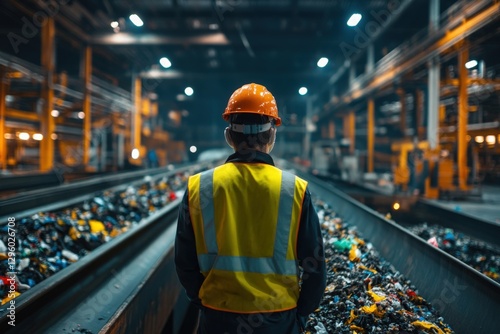 backview, young, male, men at work, helmet, pollution, mask, reflective, clothing, observing, waste, falling, conveyer belt, pile, facility, industrial, safety-gear, environmental, recycling, waste management, factory, operation, machinery, protective, tri sélectif, sustainability, environmental protection, cleanup, processing, efficiency