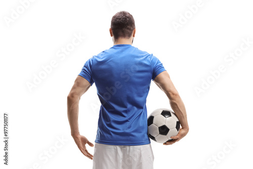 1, adult, athlete, back, background, ball, caucasian, equipment, fit, football, guy, hobby, holding, isolated, jersey, league, leisure, length, lifestyle, male, man, 1, player, professional, rear, recreation, shot, soccer, sock, sport, sportsman, standing, studio, stud, team, white, young