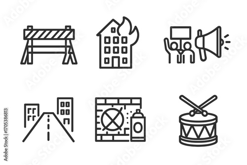 rebellion, icon, set, outline, icon, barricade, burning, building, protest, crowd, megaphone, street, graffiti, wall, police, line, drum, black, colours, consistent, stroke, weight, all, set