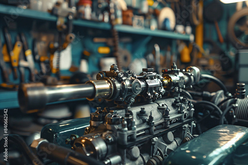 Rebuilt engine in a modern workshop. Mechanical engineering and automotive restoration concept