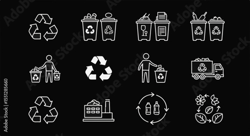 Recycling icons in minimalistic style on black background