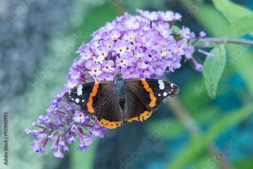 Red admiral butterfly (Vanessa Atalanta) perched on summer lilac in Zurich, Switzerland