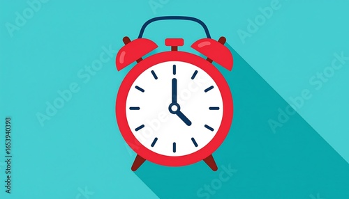 Red alarm clock, flat design, teal background
